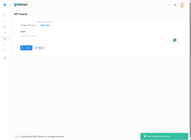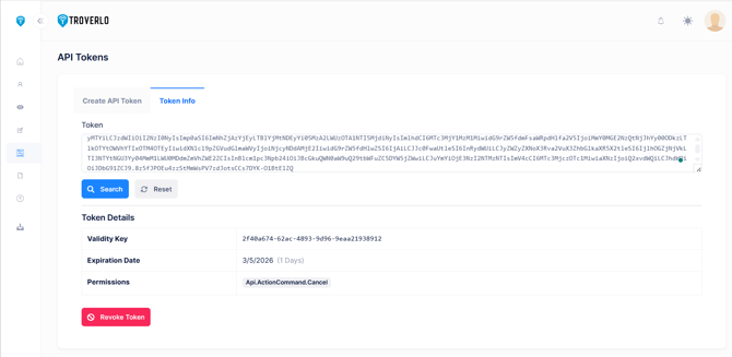 API tokens authorize a developer to use Troverlo platform's API endpoints with respect to a specific tenant (ie customer).