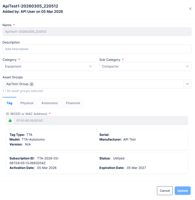 - If using Autonomo, there is a virtual tag and more details are shown about the Asset on the Autonomo tab