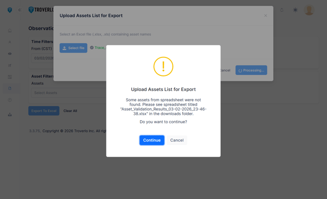 - The screen will provide feedback on what Assets were found, and you can choose if not were found to continue or to update the spreadsheet.